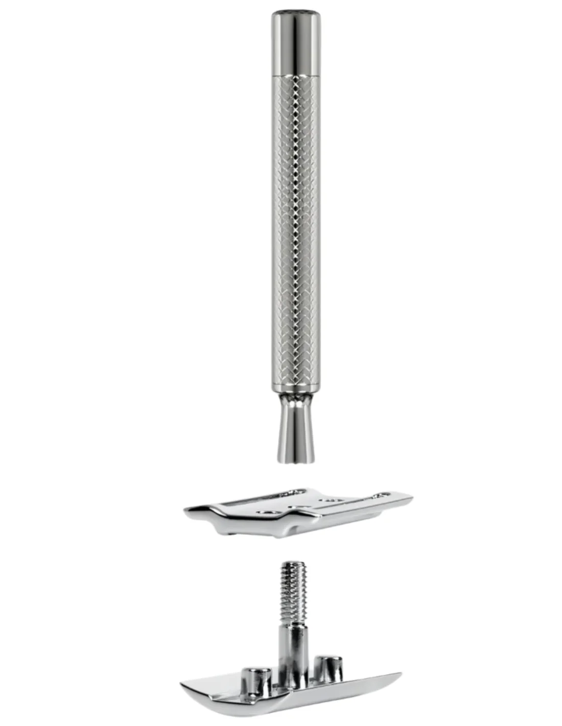 Brass handle, die-cast zinc razor head, electroplated surfaces, bright chrome finish