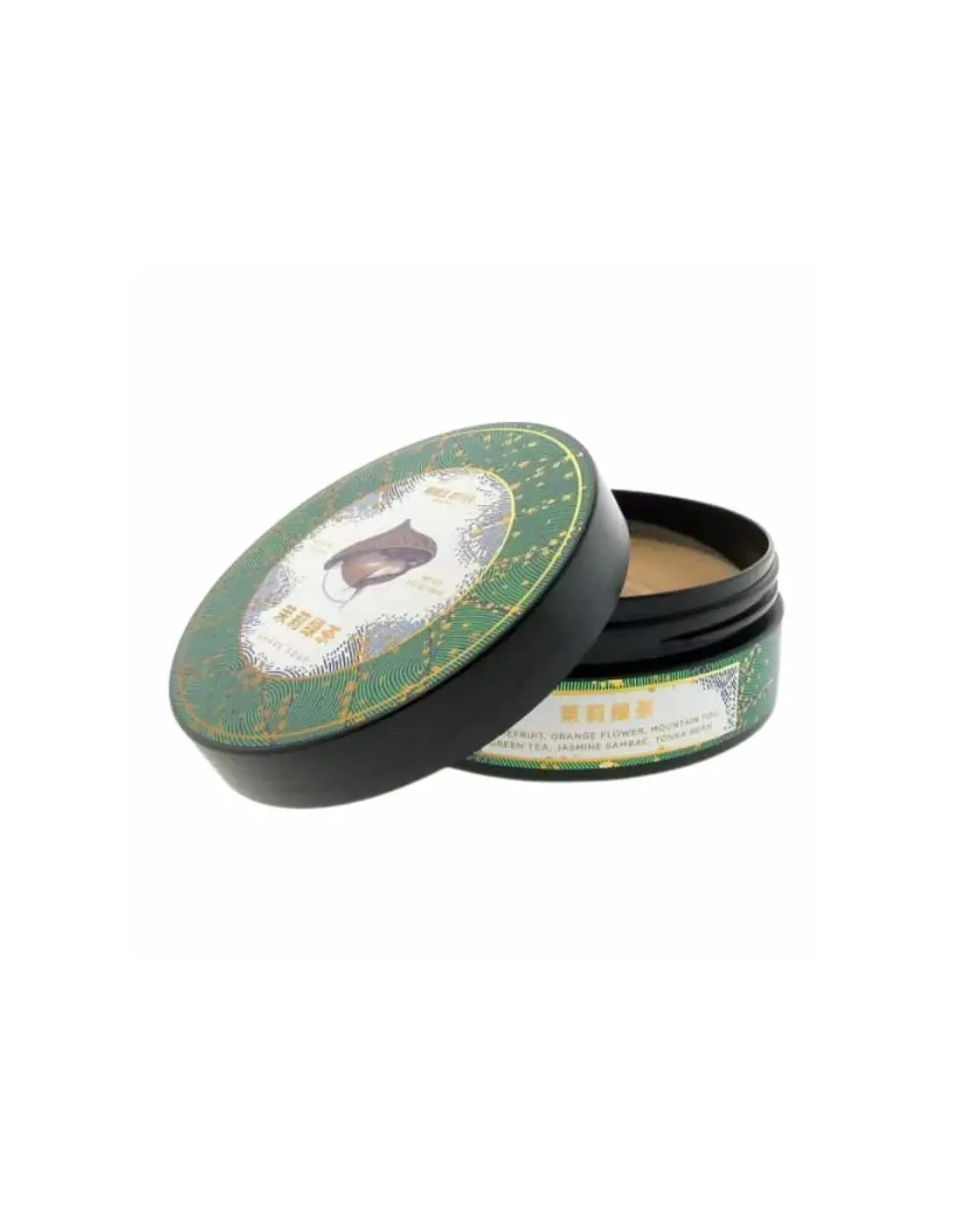 Luxurious artisan shaving soap with jasmine and green tea scent for a smooth shave.